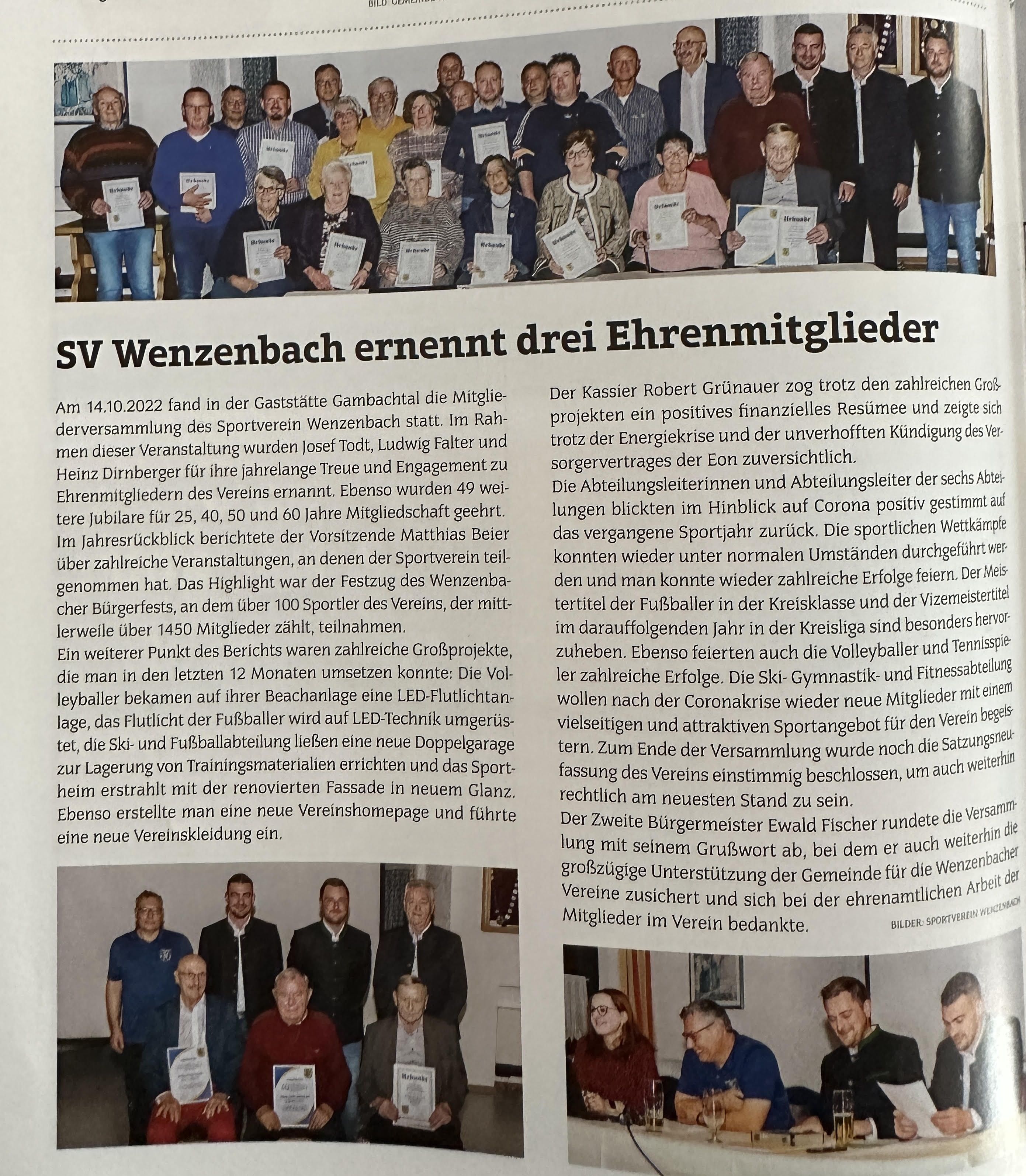 Am 14.10.2022 fand in der Gaststätte Gambachtal die Mitgliederversammlung des Sportverein Wenzenbach statt. Im Rahmen dieser Veranstaltung wurden Josef Todt, Ludwig Falter und Heinz Dirnberger für ihre jahrelange Treue und Engagement zu Ehrenmitglie…